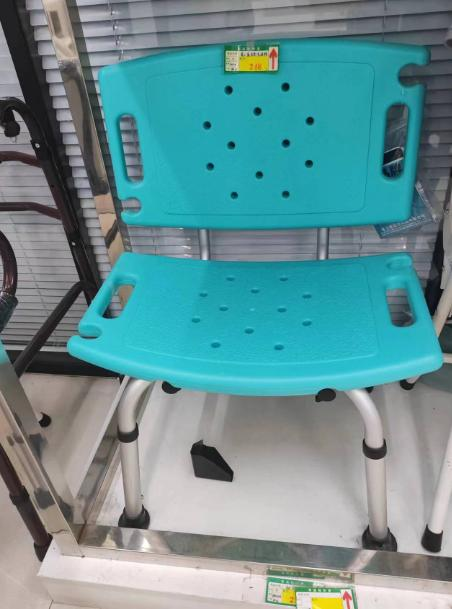 在多家線下門店,洗澡椅已成為常見的養(yǎng)老輔具。記者在現(xiàn)場看到,洗澡椅的座椅和靠背均設(shè)計了排水孔,具有良好的排水性和防水防銹性,且防滑性較好,穩(wěn)固不易側(cè)翻。但記者也發(fā)現(xiàn),一款富士康牌洗澡椅并未設(shè)置可供老人抓握的扶手,老人如想從洗澡椅上起身,則可能需要借助外力(見下圖)。